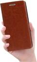 This is a latest design leather flip cover for your precious phone. The dark brown leather design is a treat to the eyes. The card slot inside allows you to keep various cards or receipts. The magnet clasp lock on the flap keeps the phone intact and allows easy opening. You can talk with the flap closed or open. The foldable stand design helps the user to watch media content in a comfortable angle. There is also a tag attached to hang the phone in your hand if you want to use it.
