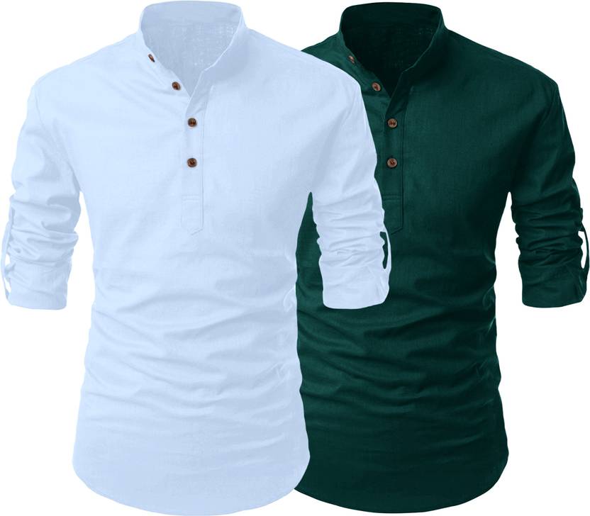 SHOPYCLICK Pack of 2 Men Solid Cotton Blend Straight Kurta (Light Blue, Dark Green)