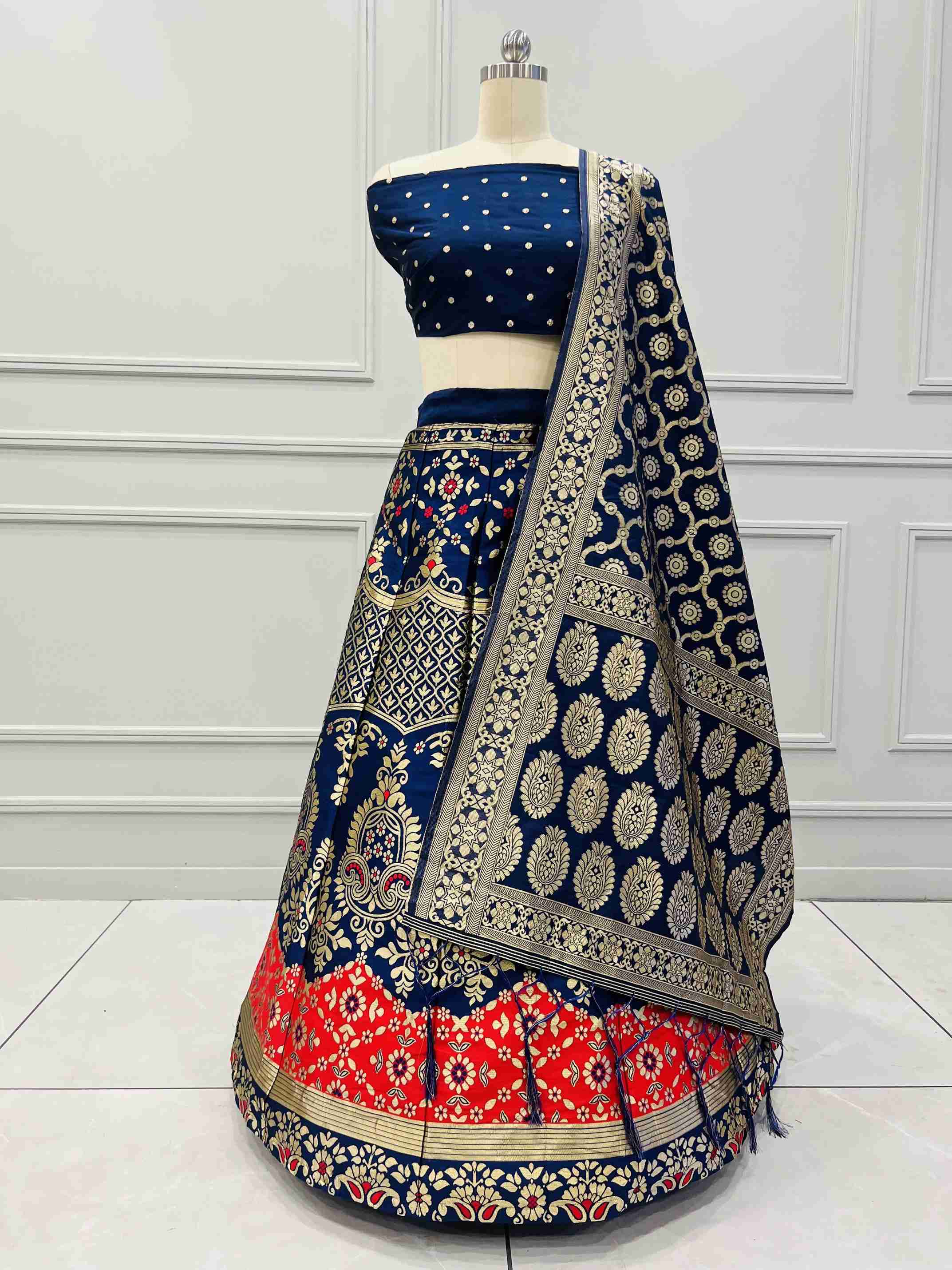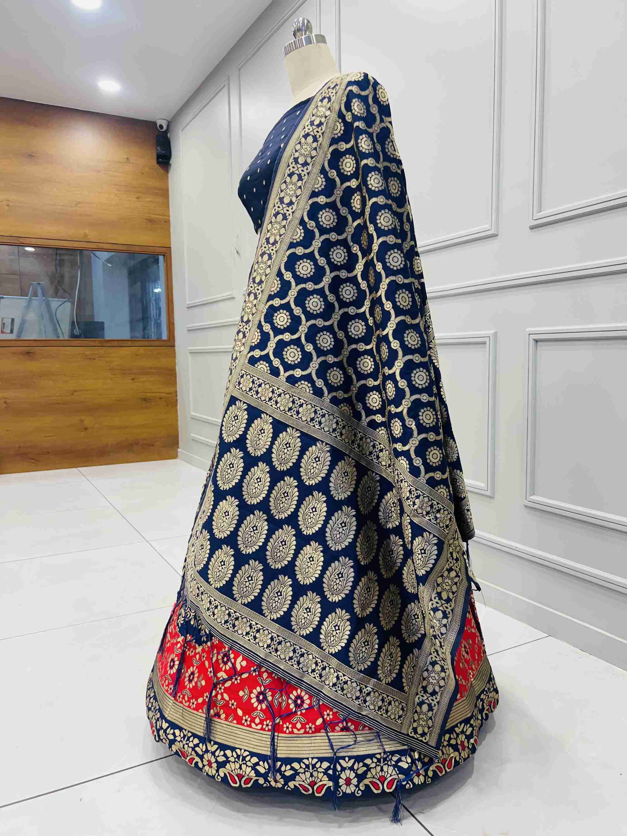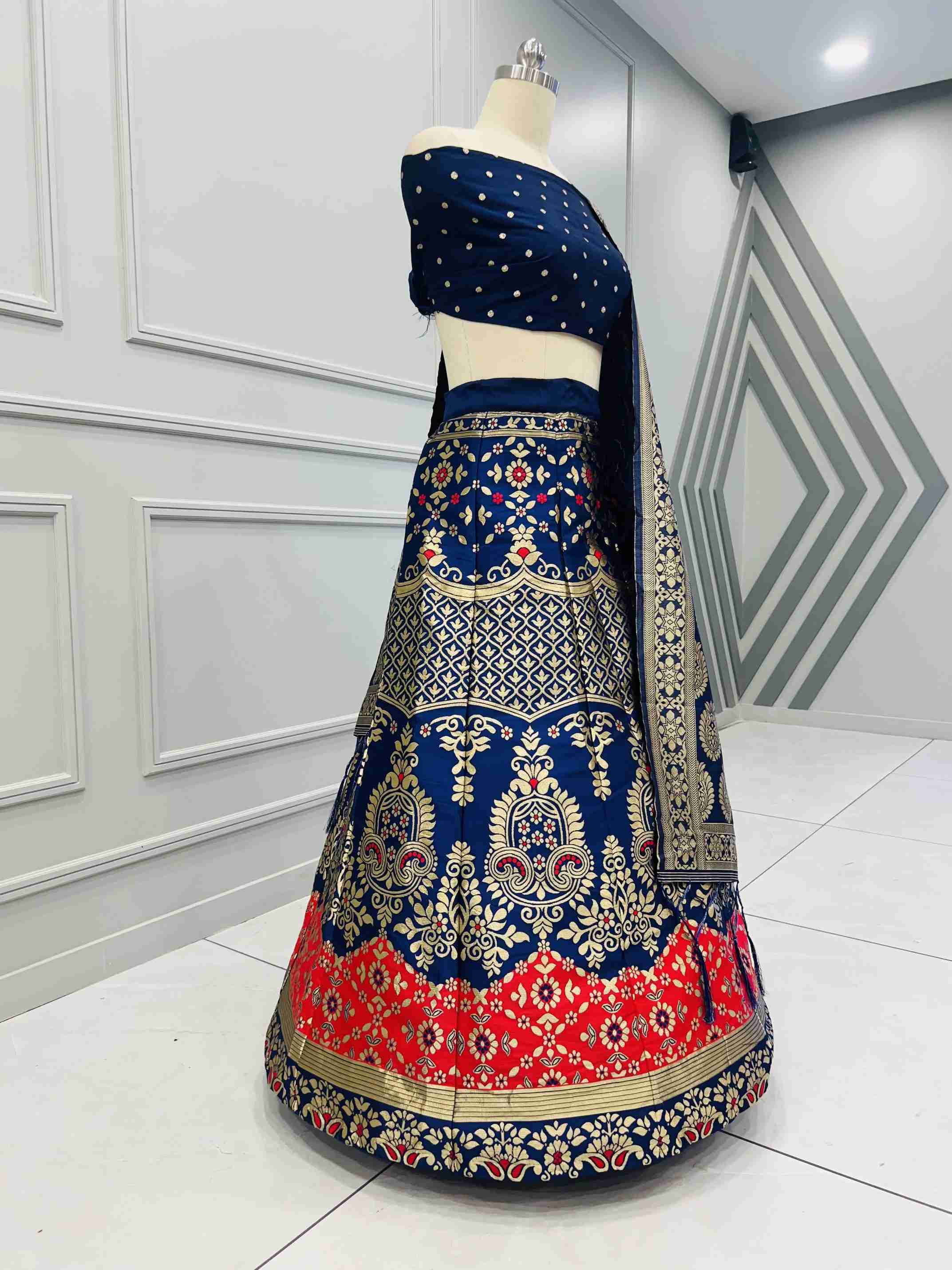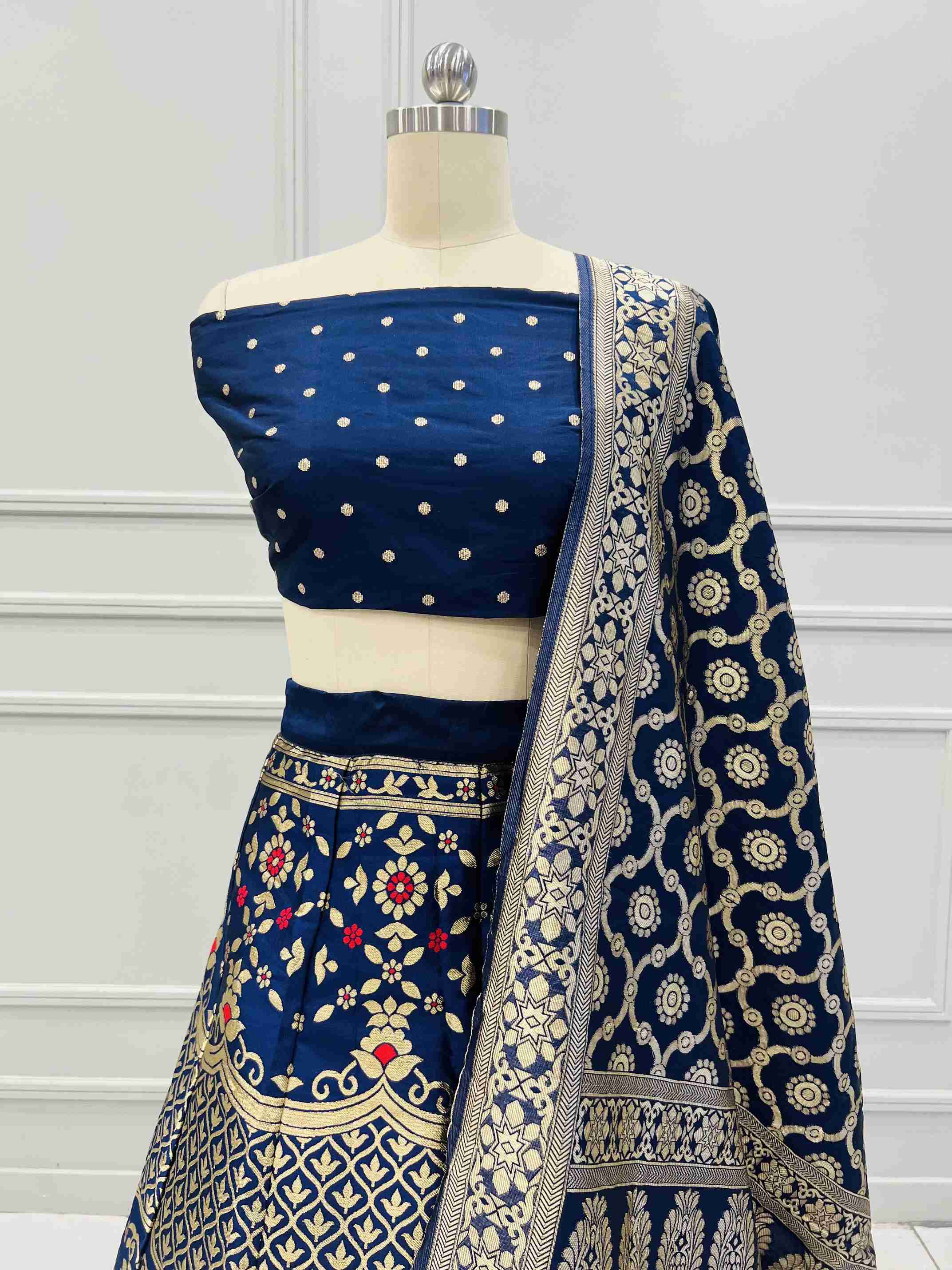 Lehenga Fabric: Banarasi silk Jacquard Choli Fabric: Banarasi silk Jacquard Dupatta Fabric: Banarasi silk Lehenga Size: Lehenga is fully stitched Lehenga Height: 41 inch Lehenga Waist Size: up to 39...