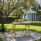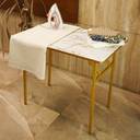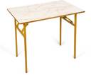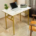• Elegant Golden Legs – sturdy powder coated steel legs in luxurious gold that add visual appeal and modern looks, Multi Functionality – capable of serving as a study table, office desk, laptop table, computer workstation, ironing board, or intimate dining surface with ease and elegance., Anti Slip & Floor Friendly Feet – equipped with rubber or adjustable base caps to prevent slippage and protect surfaces in busy environments such as offices and restaurants., Portable Yet Robust Design – despite its solidity, the table is light enough to move or fold, making it perfect for on the go events, exhibitions, or dynamic workspaces., Durable & Load Bearing – crafted from solid steel legs and thick board material to support daily workloads, electronics, meals, or even irons., Stylish Marble-Look Table Top - The premium faux-marble finish adds a touch of elegance while being resistant to scratches, stains, and heat., Easy to Clean Surface - Wipe-clean laminate surface ensures low maintenance even after meals, crafting, or ironing.