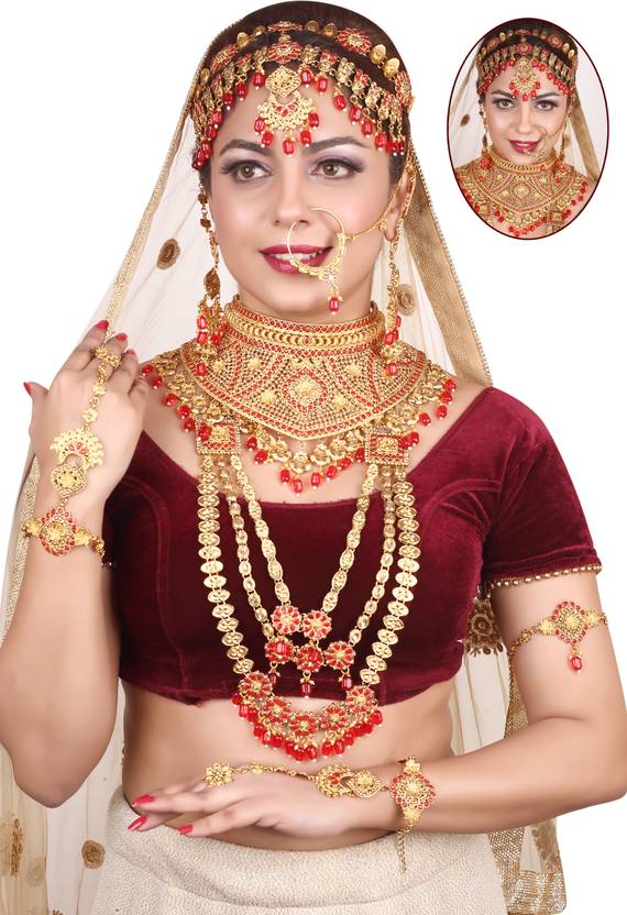 SHREE MK JEWELLERS Presents This Wedding complete jewellery dulhan set/bridal set for wedding, we provide 1-Short Choker , 1- Necklace, A Pair Hath-phool, A Pair of Earrings, 1 side jhoomar passa, 1 Nose Ring, 1 Maang-Tikka-Total 8 item complete set, Add shine to your look with this classy and elegant necklace set from SHREE MK JEWELLERS. Look - Attractive and glossy finish bridal set. Special Feature - Light Weight and Flexible that helps you in wearing long time. Made: It is made from good quality of stone and kundan with a blend of gold plating and hence the look of the set is rich. Skin Friendly: The Necklace has been made from toxic free materials being nickel & lead free. Of course, the earrings will not cause any skin reactions, perfect for people with sensitive skin.