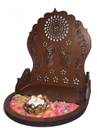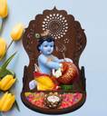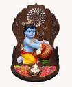1 krishna statue, 1 tealight candle, and decorative stones with 1 mini wooden temple.