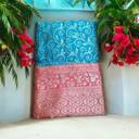 The blue and pink combination with a tree motif suggests a design that is both colorful and nature-inspired, likely with detailed and artistic embroidery. Such a saree would be perfect for special occasions or festivals where you want to make a statement with a beautiful blend of tradition and creativity. If you're looking to buy or learn more about this specific saree, you might want to check out boutiques that specialize in Banarasi sarees or visit online stores that offer detailed descriptions and images.