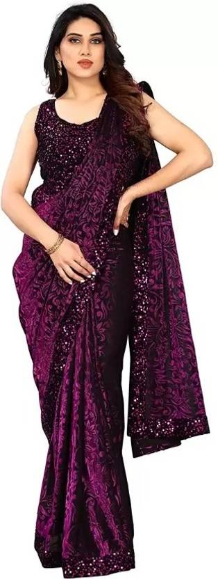 Shree Shyam Creation Digital Print, Embroidered, Solid/Plain, Printed Bollywood Lycra Blend Saree (Purple)
