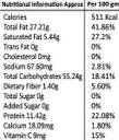 Nutrient Content | - Calories 511 Kcal, Total Fat 27.21g 41.86%, Saturated Fat 5.44g 27.2%, Trans Fat 0g 0%, Cholesterol 0mg 0%, Sodium 67.60mg 2.81%, Total Carbohydrates 55.24g 18.41%, Dietary Fiber 1.40g 5.60%, Total Sugar 0g 0%, Added Sugar 0g 0%, Protein 11.42g 22.08%, Calcium 18.09mg 1.80%, Vitamin C 9mg 15%
