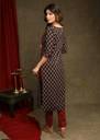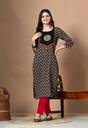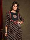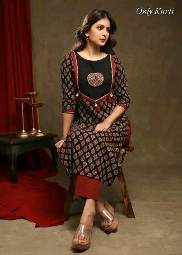 Step out in style with this beautiful black printed kurti, crafted from soft and breathable Cottan fabric. Featuring a trendy round neck with intricate detailing, 3/4th sleeves, and a straight-cut silhouette, this kurti offers both comfort and elegance. The added red tassel accents and chic print enhance its charm. Perfect to pair with leggings, palazzos, or pants for casual outings, office wear, or festive occasions. A must-have addition to your ethnic wardrobe!