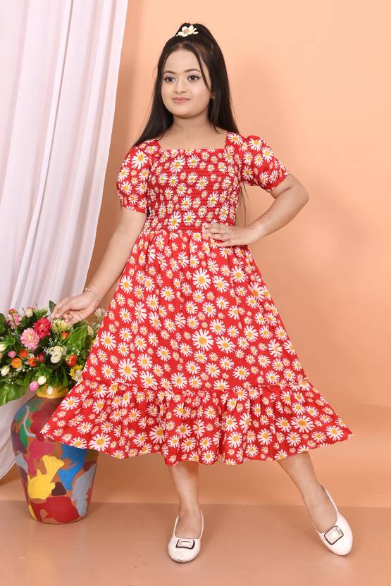 SHREESHYAMDARBAR Indi Girls Calf Length Festive/Wedding Dress (Red, Short Sleeve)