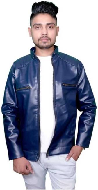 This stylish regular fit jacket in the display has full sleave and stand collar. Inside one pocket and branded zippers, this faux leather jacket is light in weight and will ensure cofort all time.