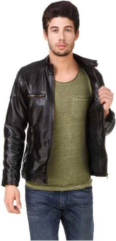 This stylish regular fit jacket in the display has full sleave and stand collar. Inside one pocket and branded zippers, this faux leather jacket is light in weight and will ensure cofort all time.