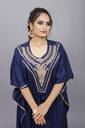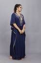 The kaftan's flowing silhouette creates a graceful and flattering drape, perfect for a range of occasions. The neckline features a captivating floral motif, intricately embroidered with shimmering sequins and beads. The golden embellishments extend along the sleeves and hemline, adding a touch of sparkle to every step.