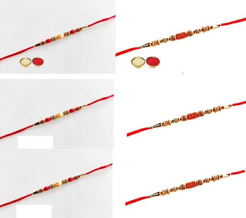 Kids Gold-Peral-Red-Moti-Law-Bro Mauli Thread Rakhi Set (Pack of 6 Rakhi)