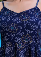 This outfit is distinguished by its Bandhani design, a traditional Indian tie-dye method. Before dyeing the cloth, small, complex knots are tied on it to create captivating, vivid patterns known as bandhani. Your dress is truly a work of art because of the floral bandhani, which emits a feeling of cultural richness and beauty.