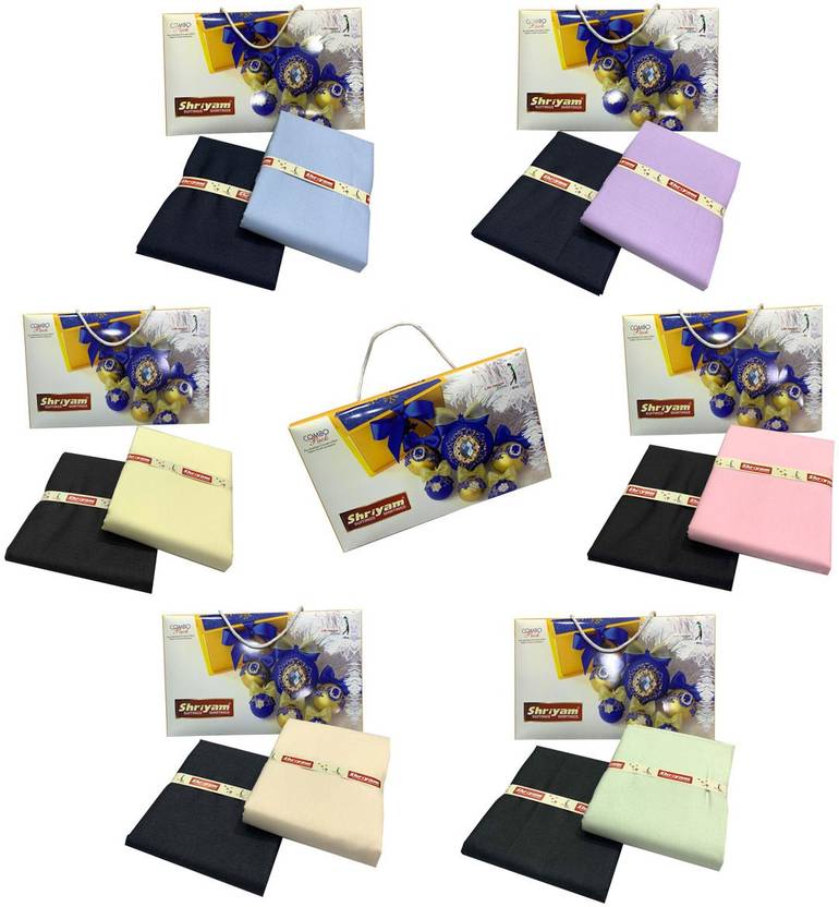 Shriyam Gift Box Packing of 6 Combo of Premium Plain shirt and Pant::Exclusive Combo-Pre Matched Suiting & Shirting For all occasions in Gift Box packing.::Light weight wrinkle free and tear resistant cloth which is Stylish, ready to stitch shirt and trouser fabric set from the house of SHRIYAM - Life Means More::Fabric : PC Cotton and Poly Viscose, Colorful and attractive gift package perfect for weddings, birthdays, house warming or any other occasion::Included components: 6 Shirt Piece + 6 Pant Piece
