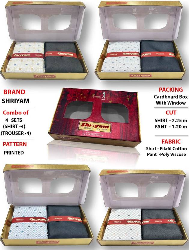 Shriyam Gift Box Packing of 4 Attractive Box Combo of shirt and Pant, Exclusive Combo-Pre Matched Suiting & Shirting For all occasions in Gift Box packing., Light weight wrinkle free and tear resistant cloth which is Stylish, ready to stitch shirt and trouser fabric set from the house of SHRIYAM - Life Means More, Fabric : PC Cotton and Poly Viscose, Colorful and attractive gift package perfect for weddings, birthdays, house warming or any other occasion, Included components: 4 Shirt Piece + 4 Pant Piece
