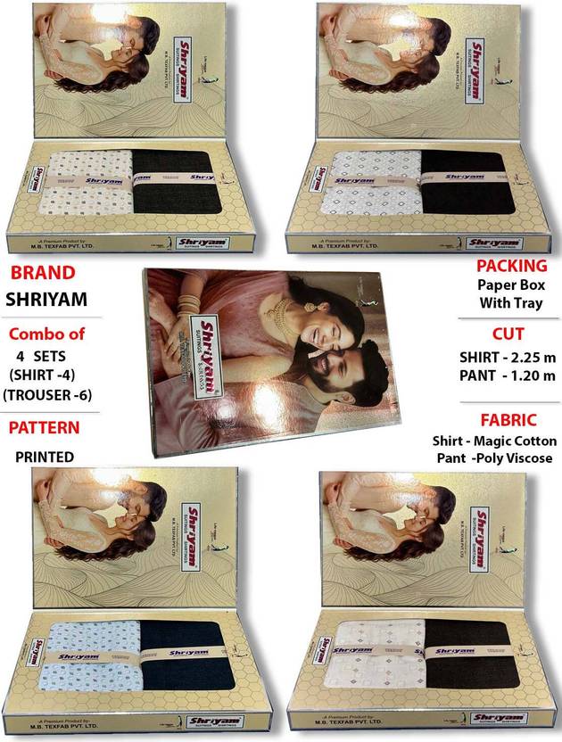 Shriyam Gift Box Packing of 4 Attractive Box Combo of shirt and Pant, Exclusive Combo-Pre Matched Suiting & Shirting For all occasions in Gift Box packing., Light weight wrinkle free and tear resistant cloth which is Stylish, ready to stitch shirt and trouser fabric set from the house of SHRIYAM - Life Means More, Fabric : PC Cotton and Poly Viscose, Colorful and attractive gift package perfect for weddings, birthdays, house warming or any other occasion, Included components: 4 Shirt Piece + 4 Pant Piece