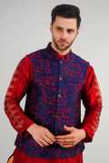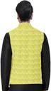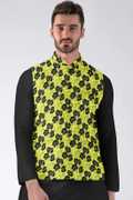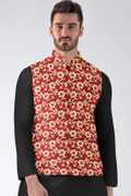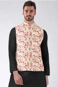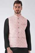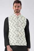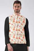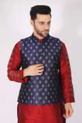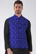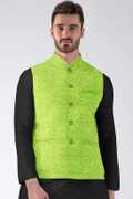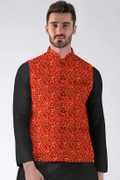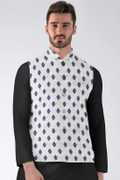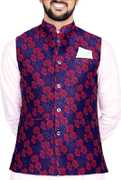 Enhance your ethnic look instantly with this waistcoat. The item follows a sleeveless style and features a mandarin collar with a button placket on the front, welt pockets and an eye-catchy all-over print. Crafted using excellent cotton jacquard fabric to render a remarkable look to the wearer. Country of Origin: India"