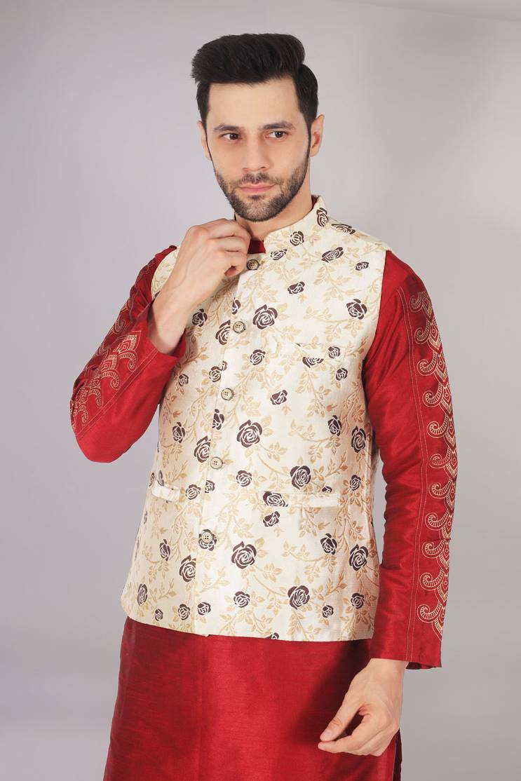 Enhance your ethnic look instantly with this waistcoat. The item follows a sleeveless style and features a mandarin collar with a button placket on the front, welt pockets and an eye-catchy all-over print. Crafted using excellent cotton jacquard fabric to render a remarkable look to the wearer. Country of Origin: India"