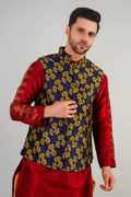 Enhance your ethnic look instantly with this waistcoat. The item follows a sleeveless style and features a mandarin collar with a button placket on the front, welt pockets and an eye-catchy all-over print. Crafted using excellent cotton jacquard fabric to render a remarkable look to the wearer. Country of Origin: India"