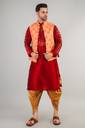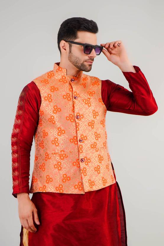 Enhance your ethnic look instantly with this waistcoat. The item follows a sleeveless style and features a mandarin collar with a button placket on the front, welt pockets and an eye-catchy all-over print. Crafted using excellent cotton jacquard fabric to render a remarkable look to the wearer. Country of Origin: India
