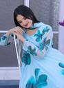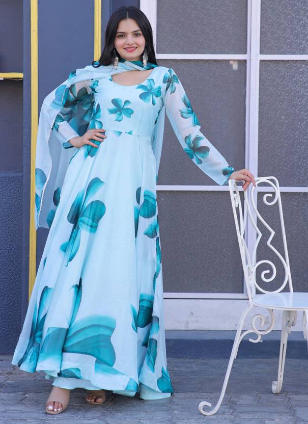 Printed Cotton Blend Stitched Flared/A-line Gown (Blue)