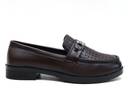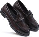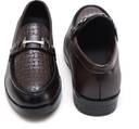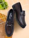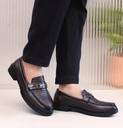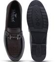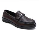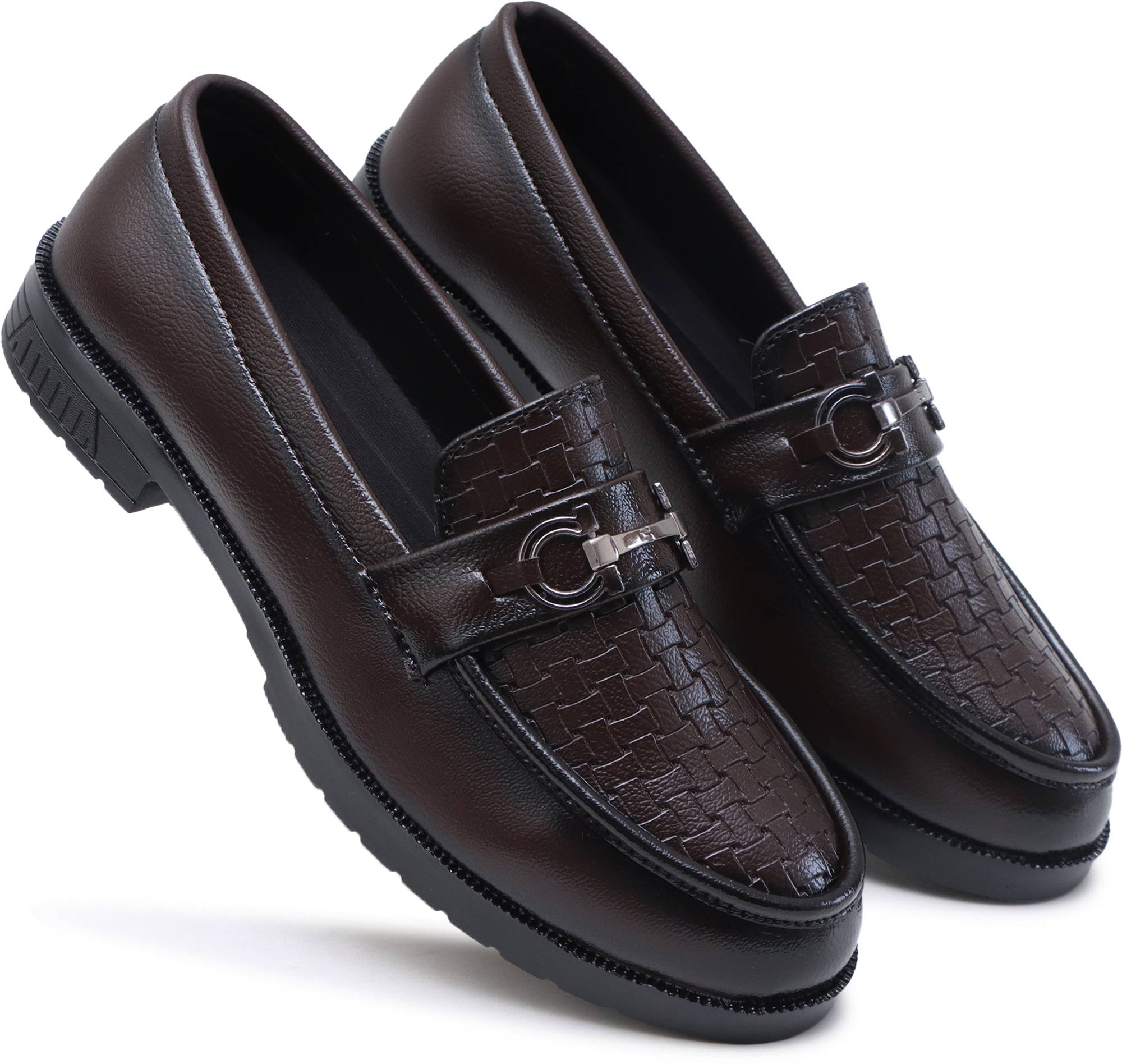 Step out in style and comfort with these classic black men's loafers. Crafted with a textured upper, these slip-on shoes feature a distinctive woven pattern on the vamp, adding a touch of sophistication. A sleek silver-toned metallic buckle enhances the elegant design. The low, stacked heel and durable, patterned outsole provide both stability and grip, making them perfect for all-day wear. These versatile loafers are ideal for pairing with casual trousers, chinos, jeans, or even semi-formal attire for a polished look. They are a great addition to any wardrobe, offering a blend of traditional style and modern comfort.