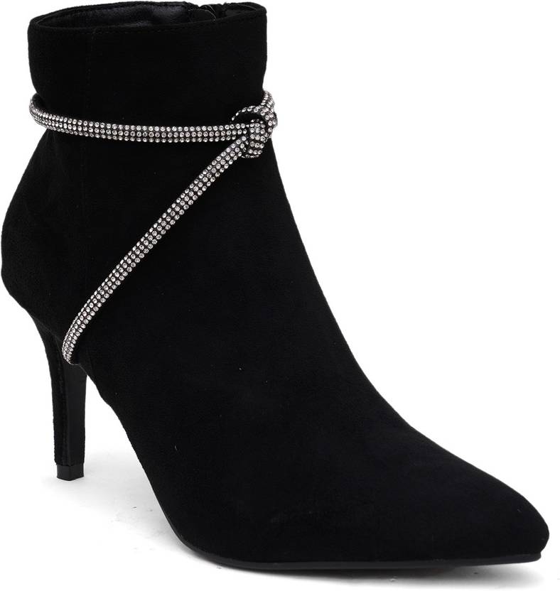 Shuz Touch Solid Pencil Heels Embelished Ankle Boots - Black Boots For Women (Black , 4)