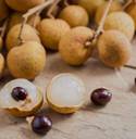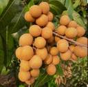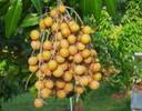 Depending upon climate and soil type the tree may grow to over 100 feet (30 m)[8] in height, but it typically stands 30–40 ft (9–12 m) in height and the crown is round.[3][9] The trunk is 2.5 ft (0.8 m) thick[3] with corky bark.[9] The branches are long and thick, typically drooping.[3] The leaves are oblong and blunt-tipped, usually 4–8 inches (10–20 cm) long and 2 in (5 cm) wide.[3] The leaves are pinnately compounded and alternate.[9] There are 6 to 9 pairs of leaflets per leaf[9] and the upper surface is wavy and a dark, glossy-green.[3] The longan tree produces light-yellow inflorescences at the end of branches.[3] The inflorescence is commonly called a panicle; they can be 4–18 in (10–46 cm) long, and widely branched.[9] The small flowers have 5 to 6 sepals and petals that are brownish-yellow.[9] The flower has a two-lobed pistil and 8 stamen. There are three flower types, distributed throughout the panicle;[3] staminate (functionally male), pistillate (functionally female), and hermaphroditic flowers.[9] Flowering occurs as a progression.[9] The fruit are circular and about 1 in (2.5 cm) wide; they hang in drooping clusters. The peel is tan, thin, and leathery with tiny hairs.[9] The flesh is translucent, and the seed is large and black with a circular white spot at the base.[3][9] This gives the illusion of an eye.[3] The flesh has a musky, sweet taste, which can be compared to the flavor of lychee fruit.[3]