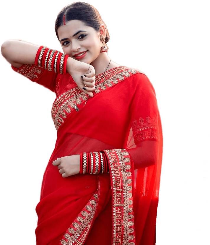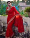 This Saree Made With High Quality Georgette Fabric and it's sada bhava Embroidered lace Boardered sari & this is Very Soft Fabric Saree so comfertable to wear and it's Comes with Red Colour Unstitched blouse piece...(Blouse Sleeve Lace also Comes with blouse piece)