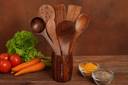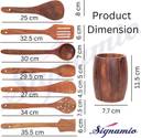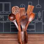 Signamio 7pcs Wooden Spoons for Cooking, Wooden Utensil Set with Holder - Set of 7 Kitchen Tool Set (Brown, Spatula, Strainer, Cooking Spoon, Ladle, Skimmer)