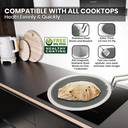 The inner layer is food-grade stainless steel (SS 304) for safe, healthy cooking. The middle core is aluminum for quick and uniform heating, while the outer layer is induction-compatible stainless steel (SS 430) – suitable for all cooktops, including gas and induction.
