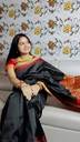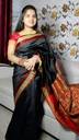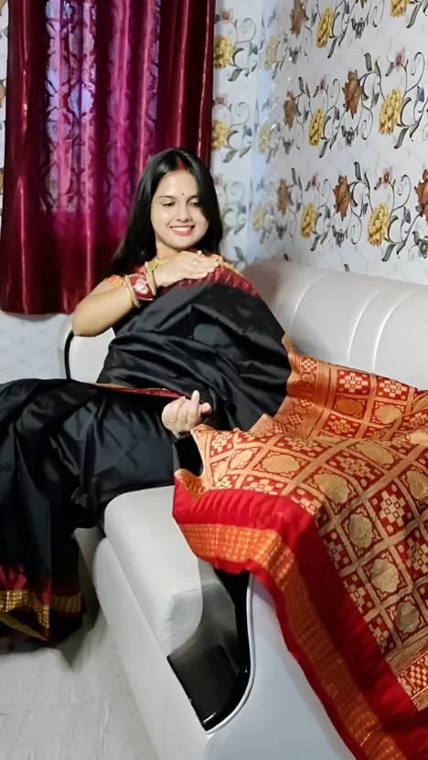 The Sambalpuri Patta silk saree exudes timeless elegance with its plain solid black body adorned with a captivating red border and intricate temple motifs. The woven zari pallu adds a touch of grandeur, making it a masterpiece of traditional craftsmanship and contemporary sophistication, perfect for any special occasion.