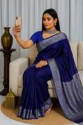 The lustrous satin-soft texture and smooth drape enhance your beauty effortlessly, making it ideal for weddings, festive celebrations, parties, and cultural functions. The silver zari pallu and intricate motifs exude regal charm, while the complementary blouse piece completes your graceful ensemble.