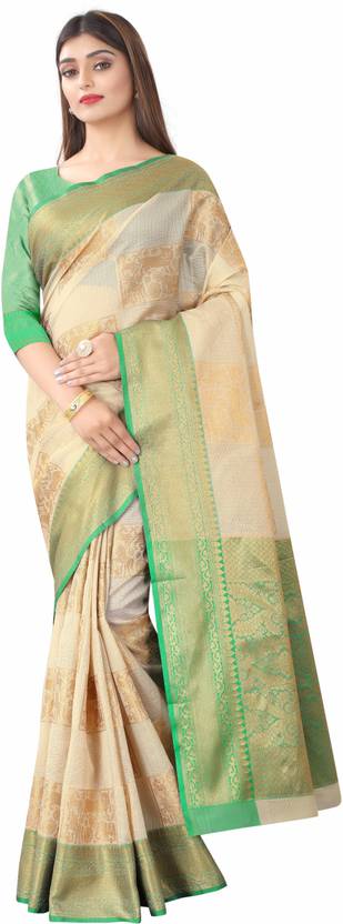 SILK ZONE Woven Kota Doria Tussar Silk Saree (Green, Beige)