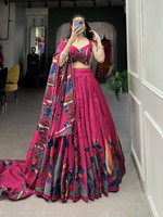 Made with a thoughtful mix of fabrics, this lehenga choli set offers textures that feel smooth and gentle against the skin. While the lehenga is crafted from art silk, lending a subtle sheen, the choli and dupatta are made from tussar silk, contributing a soft and balanced drape that complements the overall look. In addition, the combination of these materials forms a cohesive flow, offering a comfortable wearing experience that supports long wear.