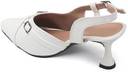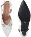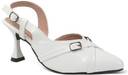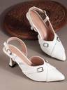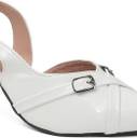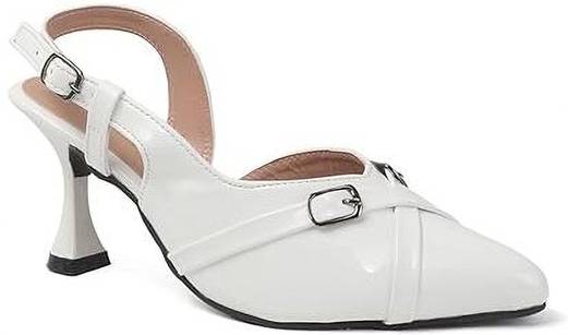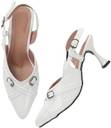 This is a pair of elegant white slingback heels featuring a pointed toe design. The vamp is adorned with two decorative silver-toned buckles, adding a touch of sophistication. It has an adjustable strap around the ankle for a secure fit. The heel is flared, providing a stylish silhouette, and tapers to a pointed base. The material has a glossy finish, resembling patent leather. These heels are suitable for formal or semi-formal occasions. Compatible products include: cocktail dresses, evening gowns, tailored pantsuits, midi skirts, clutch bags.