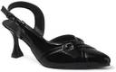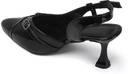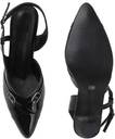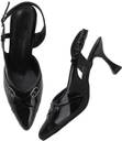 This is a pair of elegant white slingback heels featuring a pointed toe design. The vamp is adorned with two decorative silver-toned buckles, adding a touch of sophistication. It has an adjustable strap around the ankle for a secure fit. The heel is flared, providing a stylish silhouette, and tapers to a pointed base. The material has a glossy finish, resembling patent leather. These heels are suitable for formal or semi-formal occasions. Compatible products include: cocktail dresses, evening gowns, tailored pantsuits, midi skirts, clutch bags.