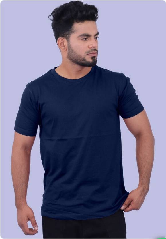 Product Name: Classic Blue Round-Neck Cotton T-Shirt Material: 100% Cotton Color: Bright Blue Fit: Regular / Slim (can specify based on preference) Neck Style: Round Neck Sleeves: Short Sleeves