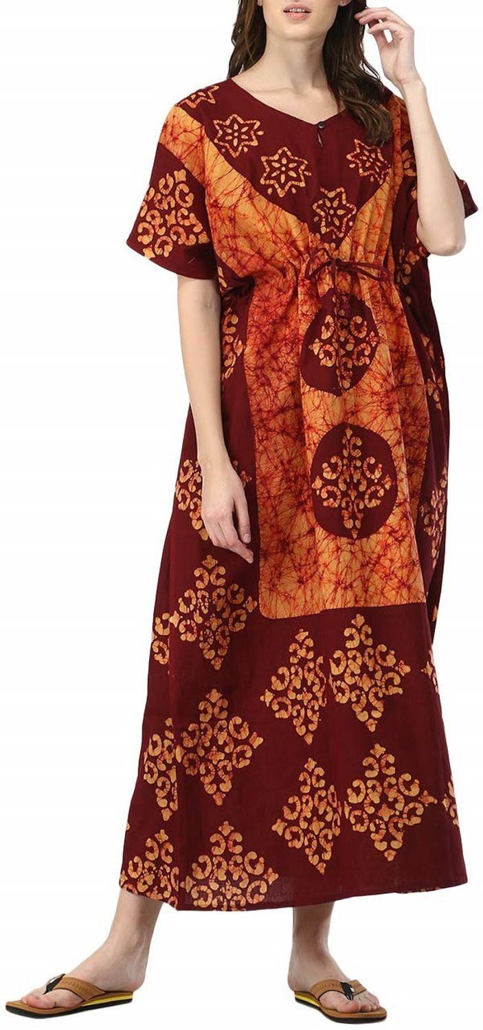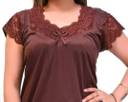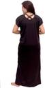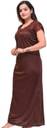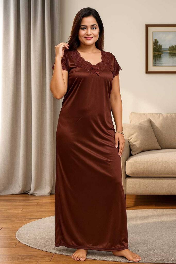 This elegant full-length nighty is crafted from a smooth, solid brown fabric, likely satin, offering a comfortable and luxurious feel. It features delicate lace detailing around the V-neckline and on the short sleeves, enhancing its sophisticated design. The back of the nighty includes a stylish criss-cross strap detail. This loose-fitting nighty is perfect for a relaxed night's sleep. Compatible with soft slippers and a comfortable sleep mask.