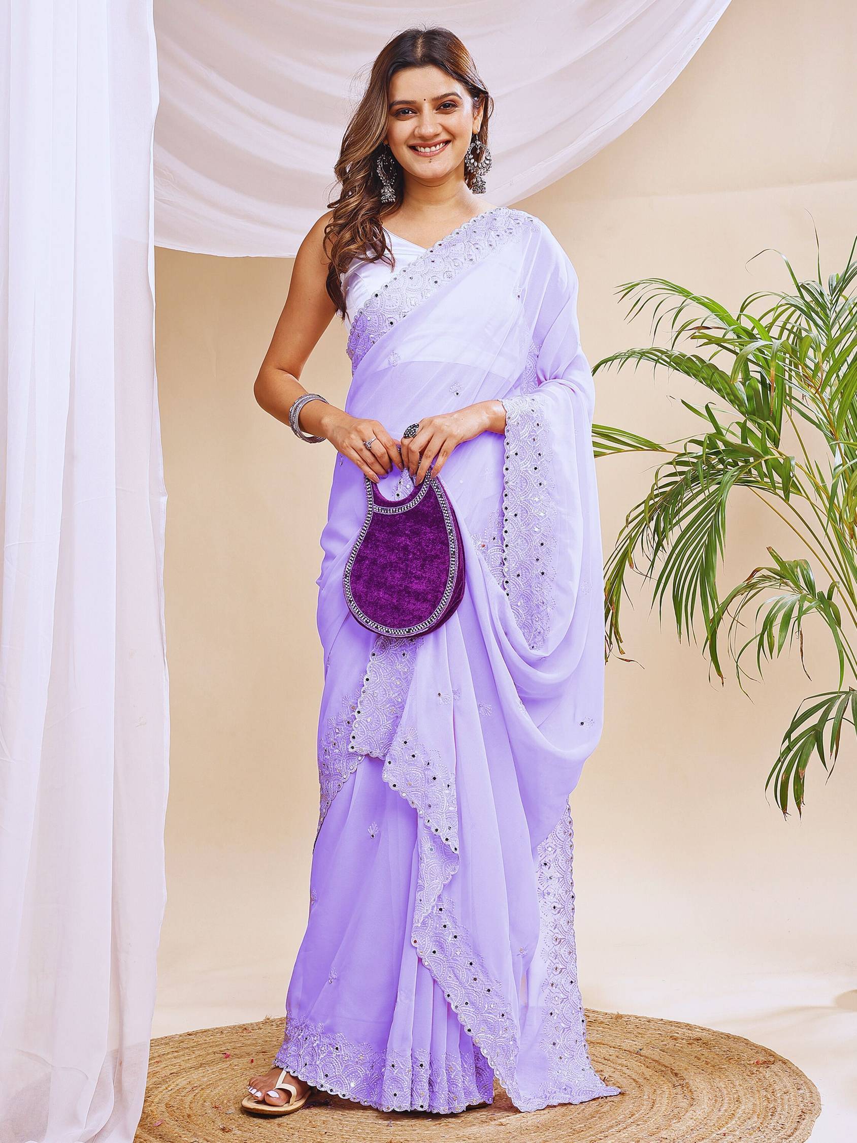 Elevate your ethnic wardrobe with this beautifully designed embroidered georgette saree for women. Adorned with intricate thread embroidery and original mirror work, this saree is a blend of tradition and contemporary elegance. The fine georgette fabric offers a lightweight, flowing feel while giving you a graceful silhouette. Whether you're heading to a wedding, festive celebration, or party, this saree will make sure you stand out. The saree comes with a satin blouse piece (unstitched), offering flexibility to design it in your own way. Pair it with statement earrings and heels for a complete ethnic look.