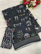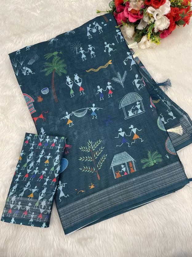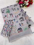 SJY Printed Assam Silk Linen Saree (Light Blue)