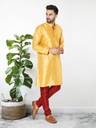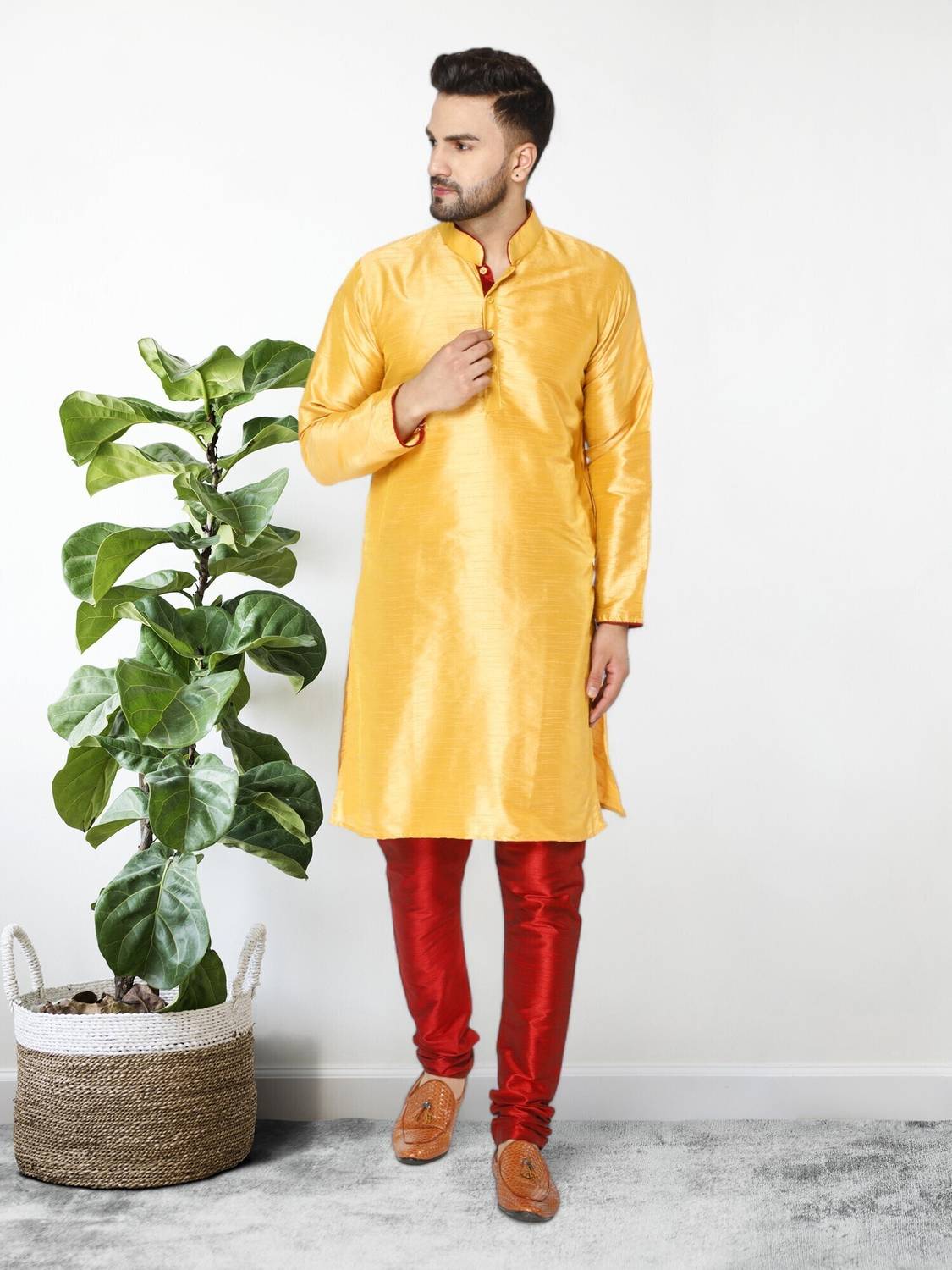 Kurta pajama set in soft dupion art silk fabric, ethnic men's wear from India. Using soft dupion art silk, our kurta tunic set brings together quality and style into one simple piece. A completely traditional Indian design, this kurta set is handmade from the absolute finest of dupion art silk and feels as light as air to treat you to stylish luxury with each and every wear. Like traditional kurtas worn in India, this kurta pajama set includes both a top and a bottom. There is beautiful button on the placket. Loose fitting sleeves and slits along the sides allow for an easy fit and let air circulate freely through the garment. The pant included in this kurta pajama set has a relaxed fit through the seat and legs for absolute comfort. Loose comfortable fitting makes it a great wear. This kurta pajama set is worn in both summer and winter. Comes with complimentary free size trouser (pajama) in soft fabric with drawstring in waist. Chest size is displayed based on body measurement NOT actual apparel measurement. Kurta's actual chest measurement is 4 inches more than the displayed chest measurement. e.g. if Kurta's actual chest measurement is 44 inches, we display it as 40 inches or 'M'. In other words, if size measured around the fullest part of your chest is 40 inches, we recommend you buy kurta displayed as 40 inches or 'M'. The actual chest measurement of kurta you will receive would be 44 inches. Kurta sets like this is traditionally worn in India for everyday wear as well as for festivals and special occasions, but in the West, they can be worn in a number of ways. Slip on the set to wear to bed as breathable, soft pajamas in any season. The ways that you can wear this luxurious two-piece set are endless, you can mix and match the pieces with other things in your wardrobe.