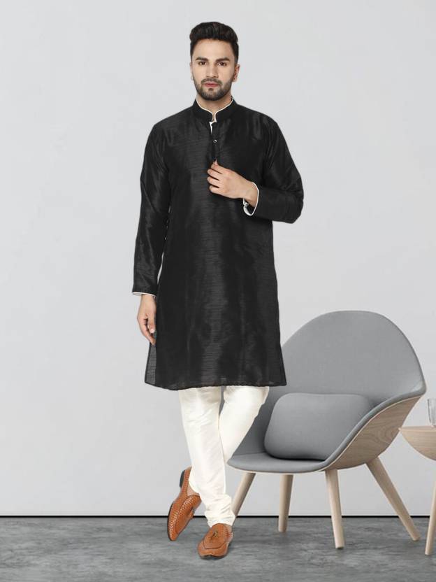 Kurta pajama set in soft dupion art silk fabric, ethnic men's wear from India. Using soft dupion art silk, our kurta tunic set brings together quality and style into one simple piece. A completely traditional Indian design, this kurta set is handmade from the absolute finest of dupion art silk and feels as light as air to treat you to stylish luxury with each and every wear. Like traditional kurtas worn in India, this kurta pajama set includes both a top and a bottom. There is beautiful button on the placket. Loose fitting sleeves and slits along the sides allow for an easy fit and let air circulate freely through the garment. The pant included in this kurta pajama set has a relaxed fit through the seat and legs for absolute comfort. Loose comfortable fitting makes it a great wear. This kurta pajama set is worn in both summer and winter. Comes with complimentary free size trouser (pajama) in soft fabric with drawstring in waist. Chest size is displayed based on body measurement NOT actual apparel measurement. Kurta's actual chest measurement is 4 inches more than the displayed chest measurement. e.g. if Kurta's actual chest measurement is 44 inches, we display it as 40 inches or 'M'. In other words, if size measured around the fullest part of your chest is 40 inches, we recommend you buy kurta displayed as 40 inches or 'M'. The actual chest measurement of kurta you will receive would be 44 inches. Kurta sets like this is traditionally worn in India for everyday wear as well as for festivals and special occasions, but in the West, they can be worn in a number of ways. Slip on the set to wear to bed as breathable, soft pajamas in any season. The ways that you can wear this luxurious two-piece set are endless, you can mix and match the pieces with other things in your wardrobe.