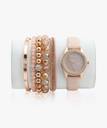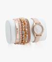This elegant women's set in all black sports a blush vegan leather strap, rsoe gold tone case and rose mother-of-pearl dial as well as 5 additional rose gold & blush jewelry accessories.