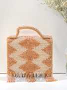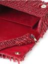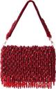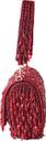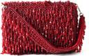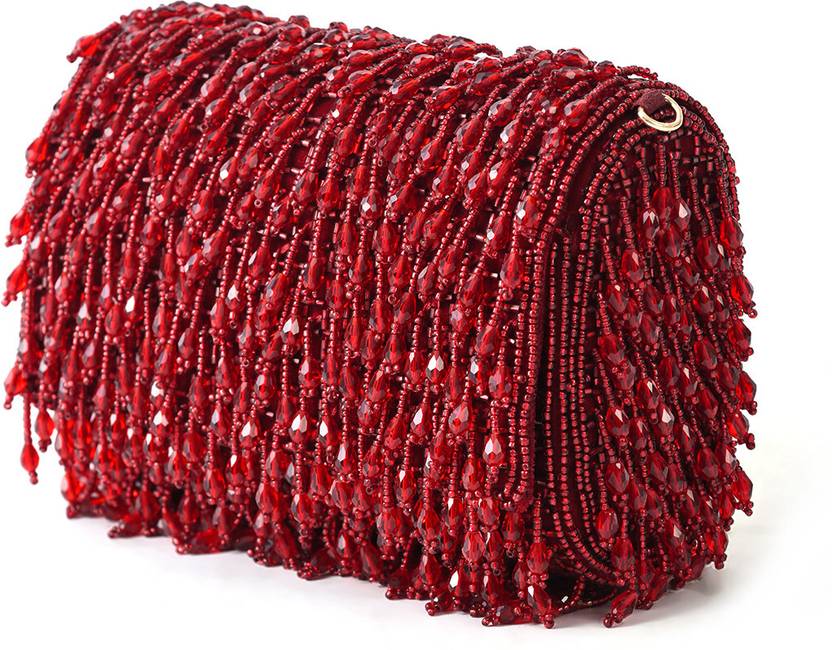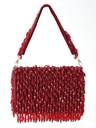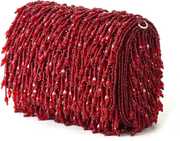 This is a striking red beaded clutch bag that exudes festive glamour and elegance. The bag features an all-over hand-embellished design with red beads and sequins arranged in vertical strands, creating a fringe-like effect. The shimmering surface adds dynamic texture and rich color, making it a bold accessory choice for evening occasions.
