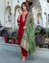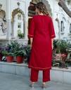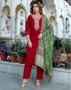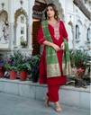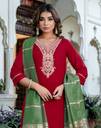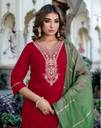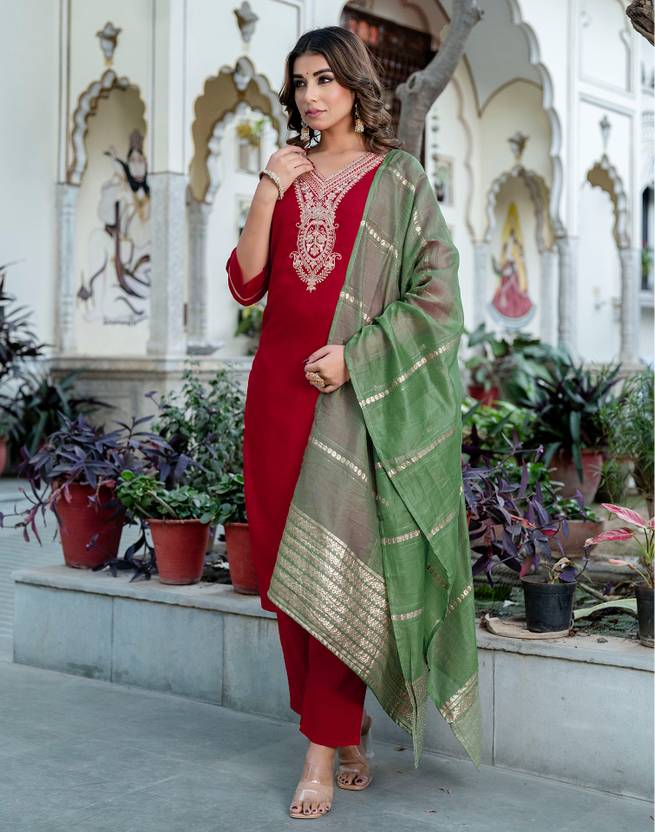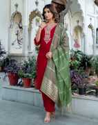 Skylee is well known brand of amazing range of women's ethnic wear in soft and solid colors that looks perfect for any occassion.With beautiful designs and patterns our apparels are very stylish and comfortable too.Get rid of the 'regular' look this season wearing this trending ethnic set by Skylee.This Calf Length Red colored Sequence Embroidery, Lace ethnic set will comes with 3/4 Sleeve and V Neck Cotton Blend kurta , Red Cotton Blend bottom and Green, Golden color Jacquard, Sequence Chanderi dupatta.Kurta Fabric : Cotton Blend , Bottom Fabric : Cotton Blend , Dupatta Fabric : Chanderi :: Kurta Work : Sequence Embroidery, Lace , Bottom Work : Dyed, (With Pocket) , Dupatta Work : Jacquard, Sequence :: Kurta Color : Red , Bottom Color : Red , Duptta Color : Green, Golden :: Bottom Waist Type : Half Elastic :: Tye : 1 Kurta::1 Pant::1 Dupatta