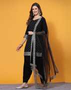 Skylee is well known brand of amazing range of women's ethnic wear in soft and solid colors that looks perfect for any occassion.With beautiful designs and patterns our apparels are very stylish and comfortable too.Get rid of the 'regular' look this season wearing this trending ethnic set by Skylee.This Calf Length Black colored Embroidery ethnic set will comes with 3/4 Sleeve and Sweetheart Neck Poly Rayon kurta , Black Poly Rayon bottom and Black color Embroidery Net dupatta.Kurta Fabric : Poly Rayon , Bottom Fabric : Poly Rayon , Dupatta Fabric : Net , Kurta Work : Embroidery , Bottom Work : Solid , Dupatta Work : Embroidery , Kurta Color : Black , Bottom Color : Black , Duptta Color : Black , Bottom Waist Type : N/A , Tye : 1 Kurta,1 Patiala,1 Dupatta Set