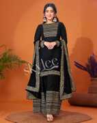 Skylee is well known brand of amazing range of women's ethnic wear in soft and solid colors that looks perfect for any occassion.With beautiful designs and patterns our apparels are very stylish and comfortable too.Get rid of the 'regular' look this season wearing this trending ethnic set by Skylee.This Calf Length Black colored Foil Printed ethnic set will comes with 3/4 Sleeve and Round Neck Viscose Rayon kurta , Black Viscose Rayon bottom and Black color Dyed, Foil Printed Lace Nazneen dupatta.Kurta Fabric : Viscose Rayon , Bottom Fabric : Viscose Rayon , Dupatta Fabric : Nazneen , Kurta Work : Foil Printed , Bottom Work : Foil Printed Patch , Dupatta Work : Dyed, Foil Printed Lace , Kurta Color : Black , Bottom Color : Black , Duptta Color : Black , Bottom Waist Type : Half Elastic , Tye : 1 Kurta,1 Sharara,1 Dupatta