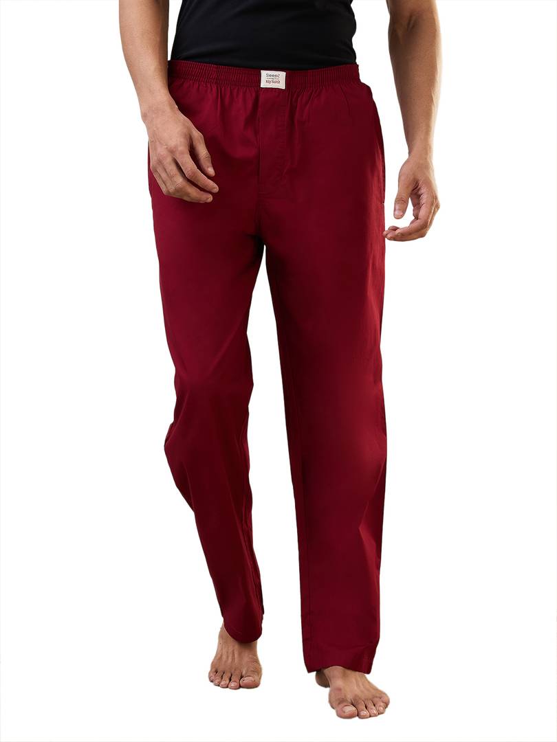 Dark Maroon Solid Cotton pyjama, has an Elasticated waistband with drawstring closure, 2 pockets.