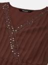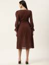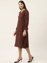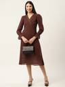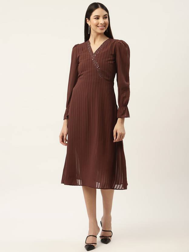 Brown striped self design fit & flare dress, Has a V-neck, Long, bishop sleeve, Embellished detail, Midi length in flared hem. This Dress has a Awesome Look as You can see actual image. BUY NOW and Try it.