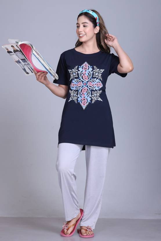 summer nightwear for women, cotton night suit, printed nightsuit set, women’s loungewear, long nightwear for ladies, stylish sleepwear, breathable cotton night suit